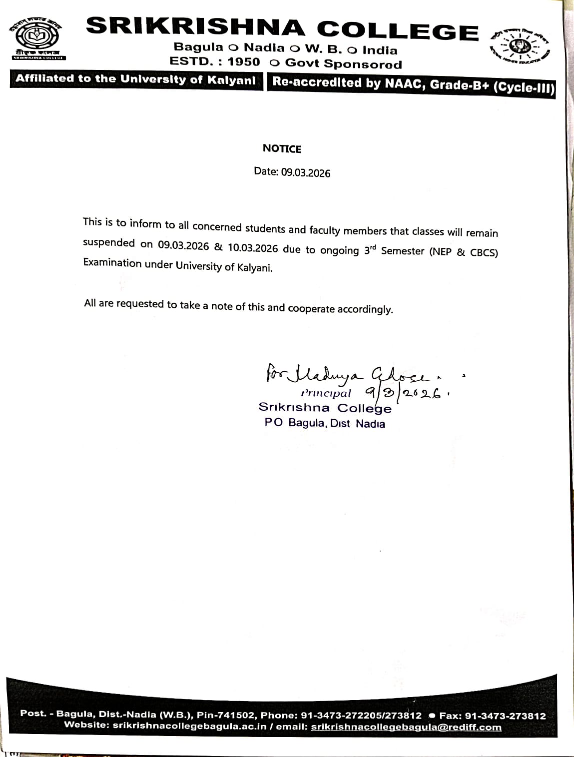 As the Principal of Srikrishna College, Bagula, I would like to share my thoughts and dreams on and about this institution. This college is based on the philosophies of continuous assessment and renovation. Read More »