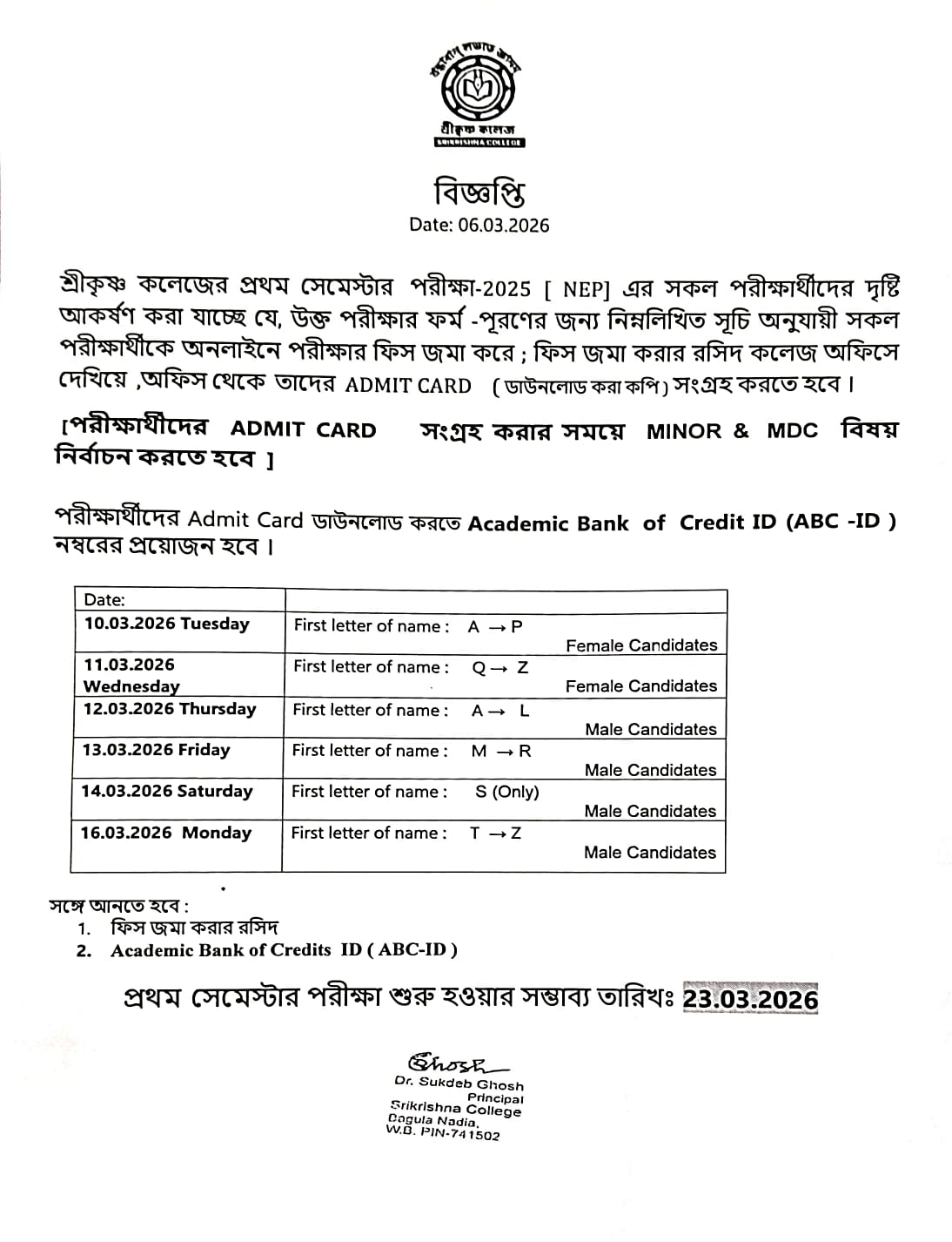 | 5 td > | 06 Mar 2026 | 1st Sem Admit Card Distribution Notice | Download | tr >