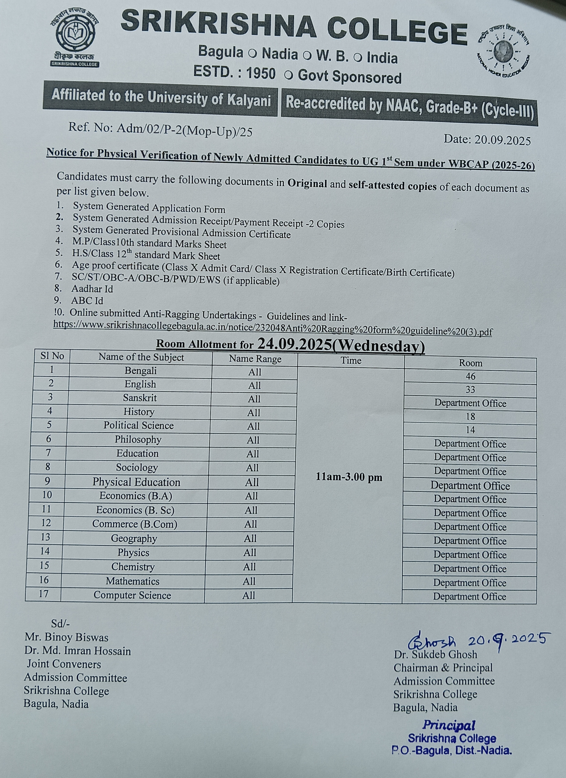 | 4 td > | 22 Sep 2025 | Notice for Physical Verification of Documents of 1st Sem 2025 Mop Up Round | Download | tr >