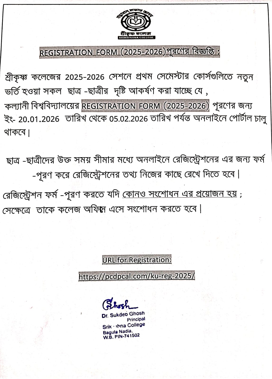 | 1 td > | 15 Jan 2026 | Notice for 1st Sem Registration Form Fill-up | Download | tr >